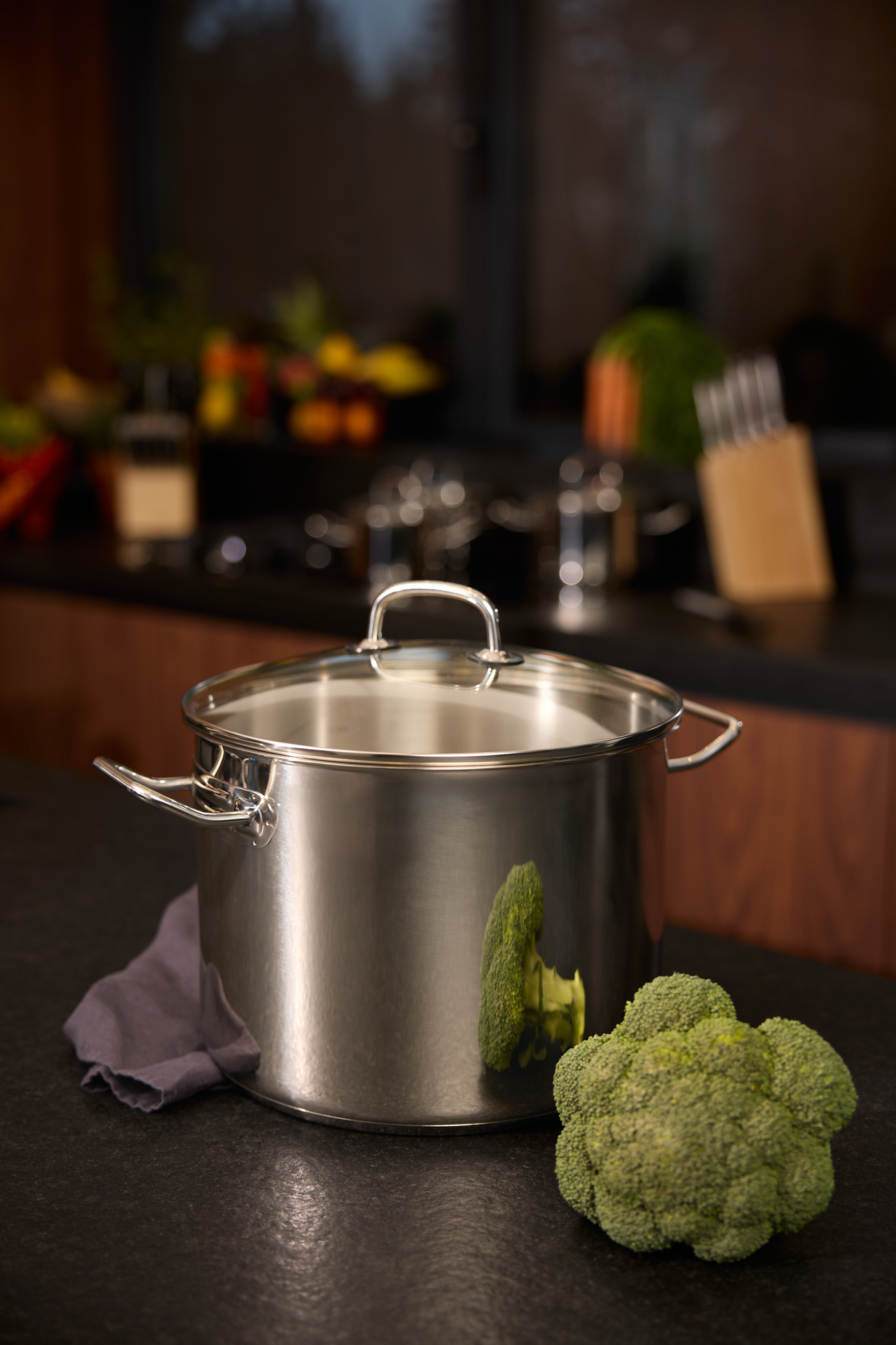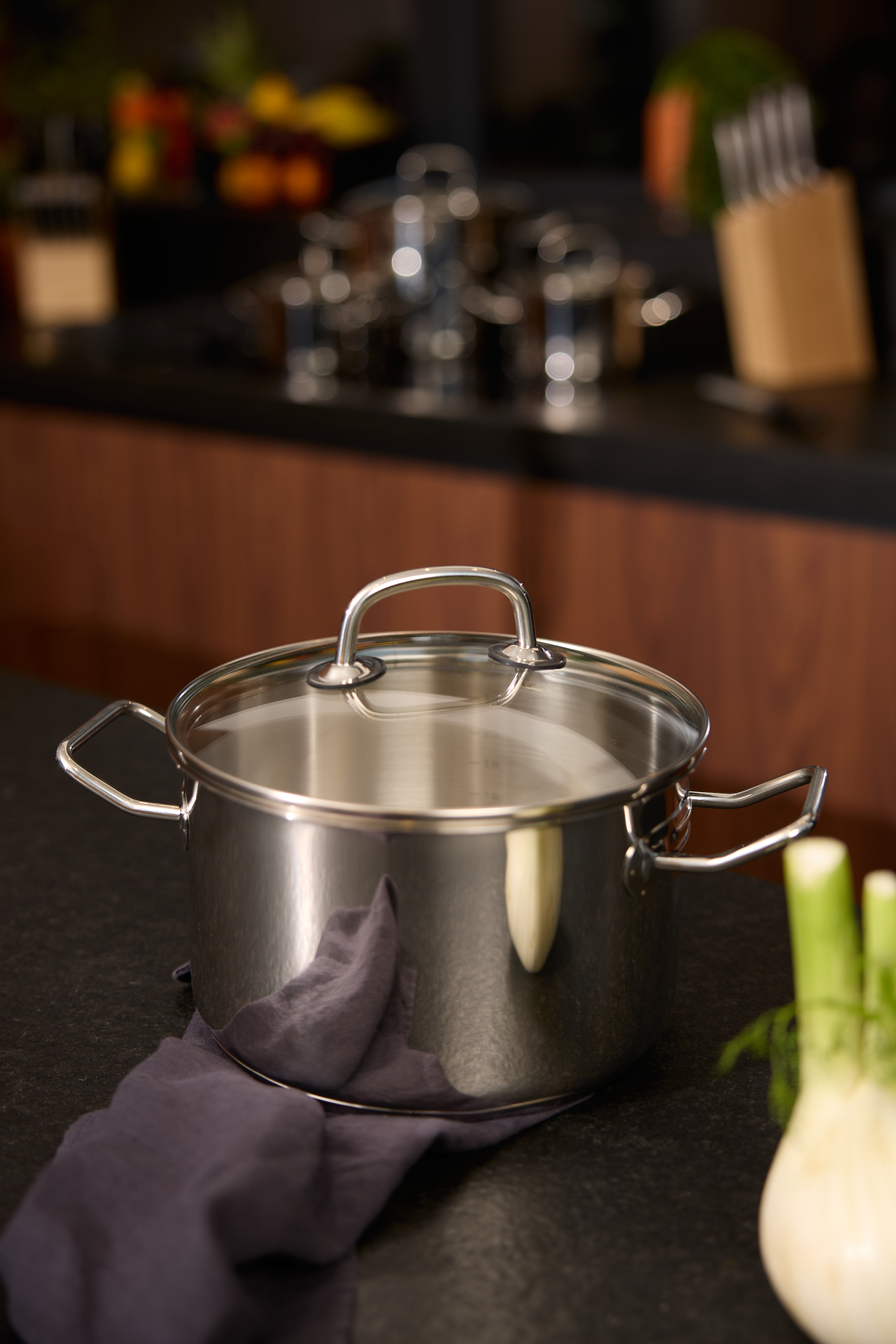 Termoakumulacyjne, trzywarstwowe dno o grubości 4,5 mm zapewnia szybkie nagrzewanie oraz równomierne rozprowadzanie i długotrwałe utrzymanie ciepła. Zakumulowane ciepło umożliwia dokończenie przyrządzania potraw w ciągu 10-15 minut po wyłączeniu płyty, co znacznie zmniejsza zużycie energii grzewczej. W środku garnka znajduje się praktyczna miarka ułatwiająca użytkowanie. Naczynia są dostosowane do wszystkich rodzajów kuchenek: elektrycznej, gazowej, ceramicznej oraz indukcyjnej. Nie są przeznaczone do użytku w piekarniku.