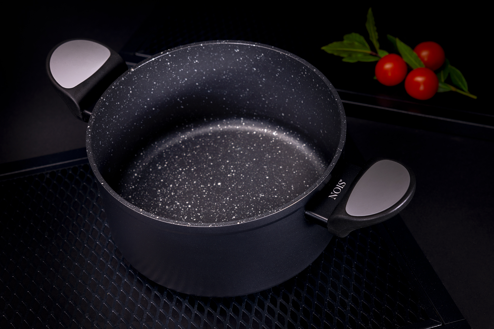 Garnek 20cm z pokrywą Silver marki "NOIS" spełni oczekiwania każdego kto lubi gotować i dusić. Wyróżnia się solidnością i trwałością. To praktyczne naczynie do gotowania wykonane jest z kutego aluminium i jest lżejsze niż odlewane. Pogrubione dno równomiernie rozprowadza ciepło podczas nagrzewania i jest odporne na odkształcenia mechaniczne i temperaturowe. Grubość ścianki garnka wynosi 4mm. Pokrywa wykonana z wypukłego szkła borokrzemowego.