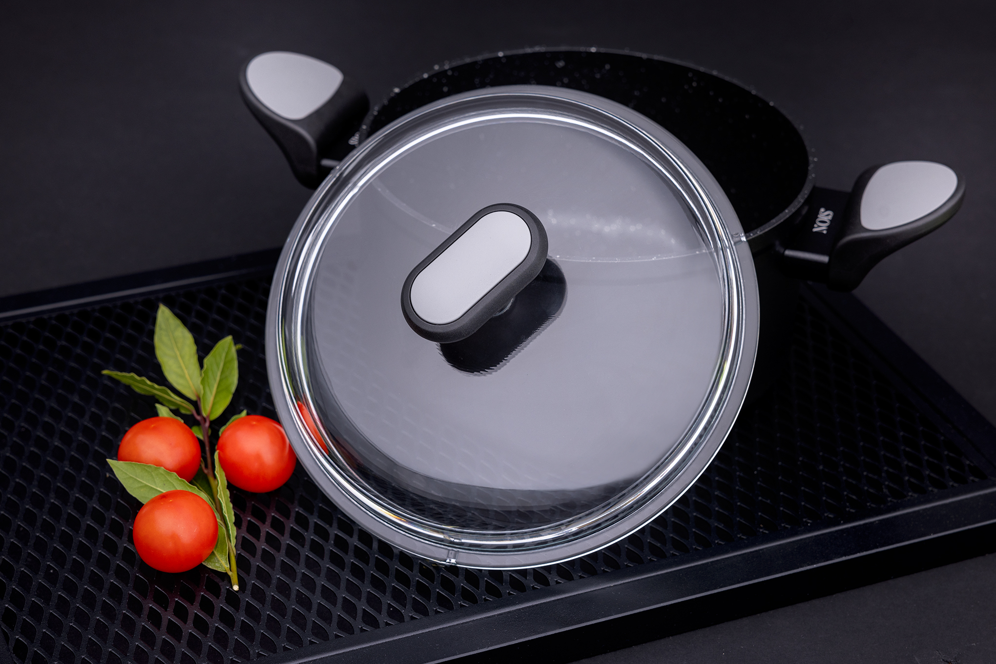 Ergonomiczne uchwyty z powłoką soft-touch nie nagrzewają się podczas gotowania. Garnek nie jest przeznaczony do użytku w piekarniku. Nadaje się do wszystkich rodzajów kuchenek: gazowej, elektrycznej, indukcyjnej. Należy korzystać z palnika o średnicy odpowiadającej wymiarom dna naczynia. Gwarantuje to szybkie przygotowanie potrawy, oszczędność energii oraz długą żywotność naczynia. W przypadku kuchenek gazowych płomień palnika powinien nagrzewać tylko 2/3 średnicy dna naczynia, a nie jego ścianki. Wówczas plastik na uchwytach nie ulegnie stopieniu.