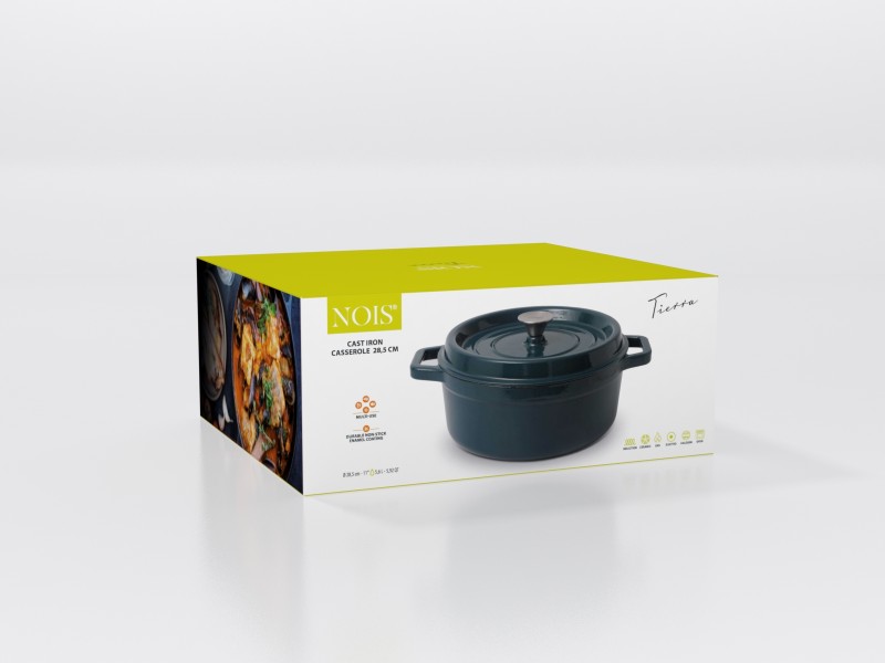 Garnek okrągły NOIS 28 cm wykonany jest z żeliwa, z zewnątrz i wewnątrz pokryty podwójną warstwą emalii przyjazną dla środowiska i odporną na wysokie temperatury. Emaliowane żeliwo spełnia wszystkie wymagania stawiane współcześnie naczyniom w zakresie przygotowywania i przechowywania żywności. Przy odpowiednim użytkowaniu przyrządzane w nich potrawy zachowują witaminy i składniki odżywcze. Masywna i szczelnie przylegająca pokrywa o specjalnej konstrukcji utrzymuje parę w naczyniu i zapewnia optymalne gotowanie. Para wodna skrapla się na wypustkach znajdujących się na wewnętrznej stronie pokrywy, a kapiąca woda równomiernie spływa na powierzchnię potraw, dzięki czemu są one soczyste i smaczne. Wszystkie części żeliwnego naczynia (dno, ścianki, pokrywa) równie długo utrzymują ciepło. Daje to pewność, że po nakryciu stołu potrawy długo pozostaną gorące. Emaliowana powierzchnia jest łatwa w utrzymaniu i czyszczeniu oraz ma estetyczny wygląd. W przeciwieństwie do tradycyjnych naczyń, w prezentowanych można przez długi czas przechowywać wcześniej przygotowane potrawy.