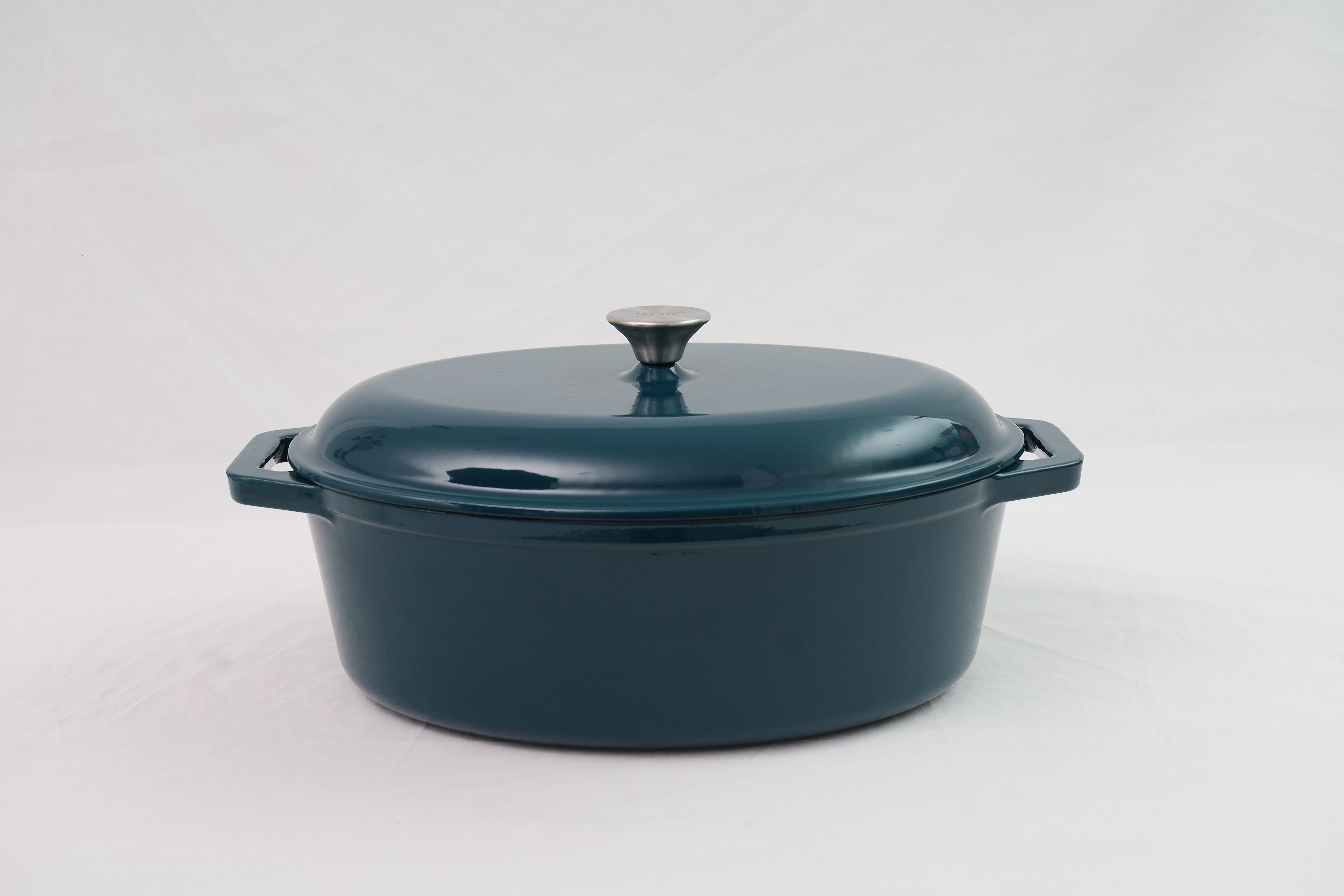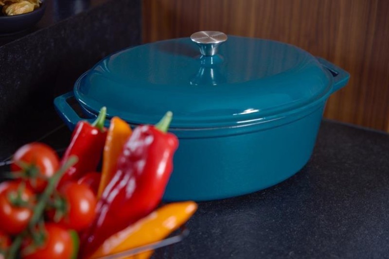 Garnek owalny NOIS 36x26,5 cm morski wykonany jest z żeliwa, z zewnątrz i wewnątrz pokryty podwójną warstwą emalii przyjazną dla środowiska i odporną na wysokie temperatury. Emaliowane żeliwo spełnia wszystkie wymagania stawiane współcześnie naczyniom w zakresie przygotowywania i przechowywania żywności. Przy odpowiednim użytkowaniu przyrządzane w nich potrawy zachowują witaminy i składniki odżywcze. Masywna i szczelnie przylegająca pokrywa o specjalnej konstrukcji utrzymuje parę w naczyniu i zapewnia optymalne gotowanie. Para wodna skrapla się na wewnętrznej stronie pokrywy, a kapiąca woda równomiernie spływa na powierzchnię potraw, dzięki czemu są one soczyste i smaczne. Wszystkie części żeliwnego naczynia (dno, ścianki, pokrywa) równie długo utrzymują ciepło. Daje to pewność, że po nakryciu stołu potrawy długo pozostaną gorące. Emaliowana powierzchnia jest łatwa w utrzymaniu i czyszczeniu oraz ma estetyczny wygląd. W przeciwieństwie do tradycyjnych naczyń, w prezentowanych można przez długi czas przechowywać wcześniej przygotowane potrawy.