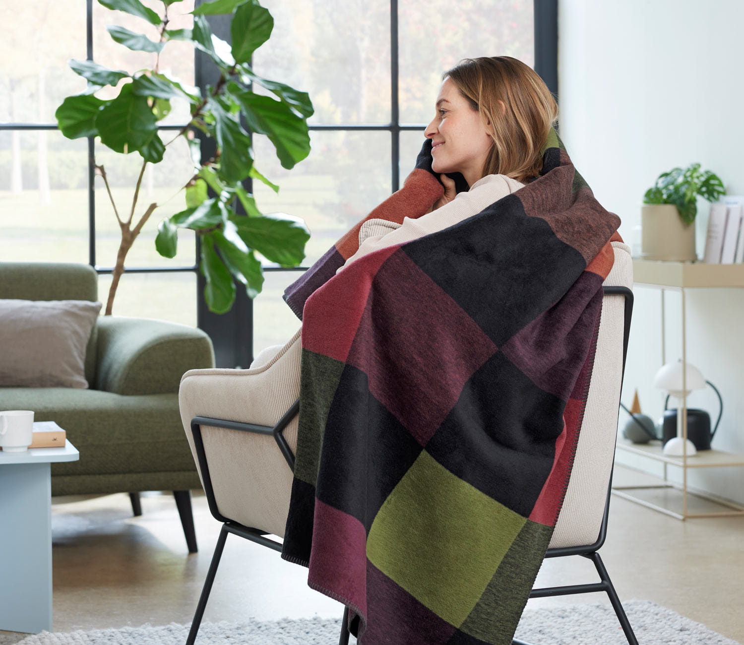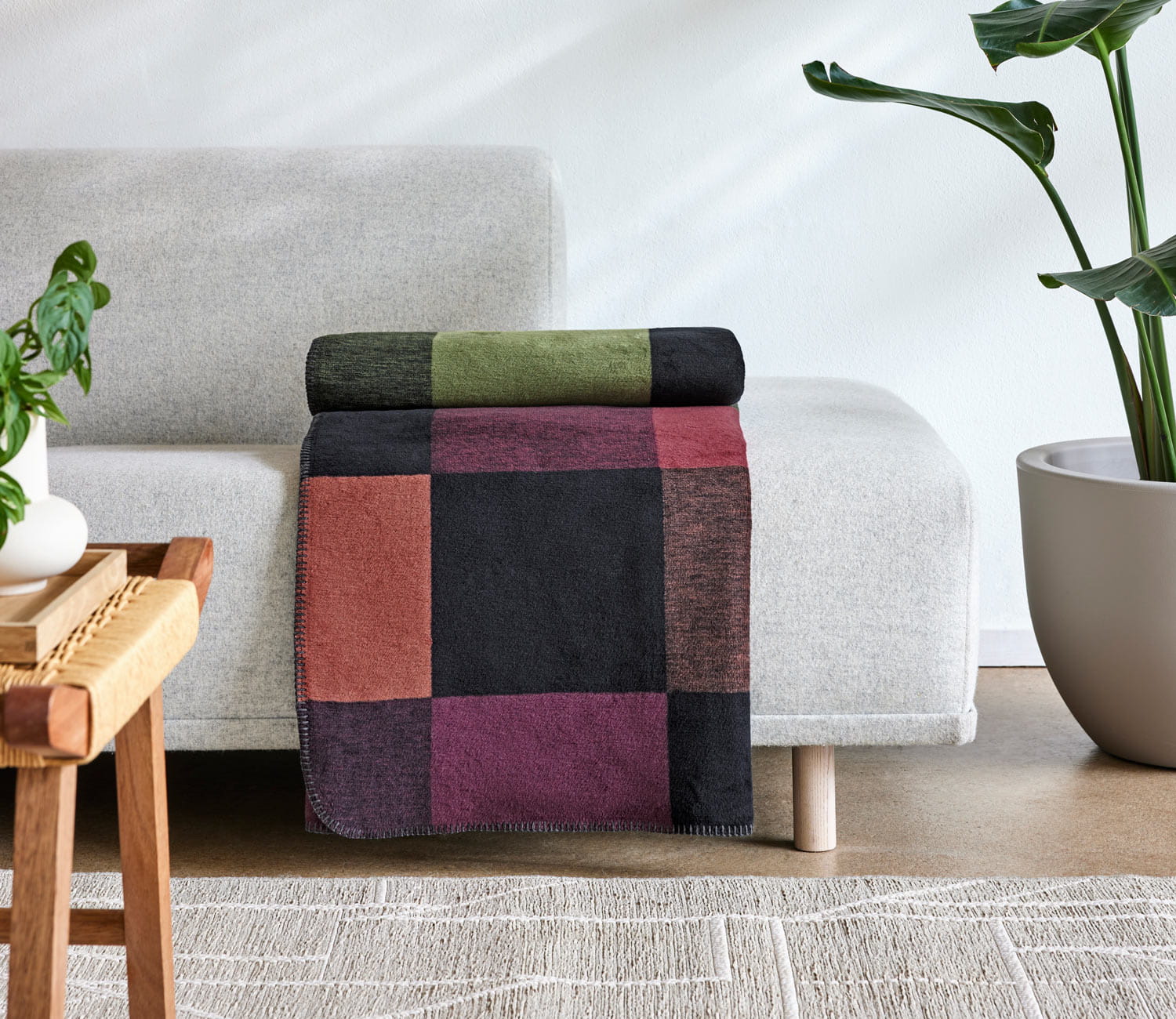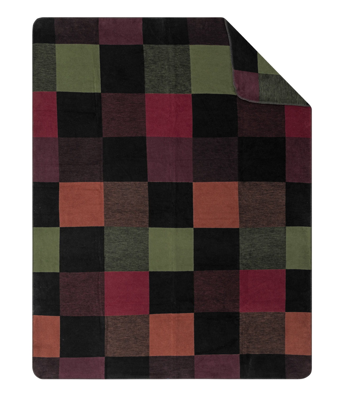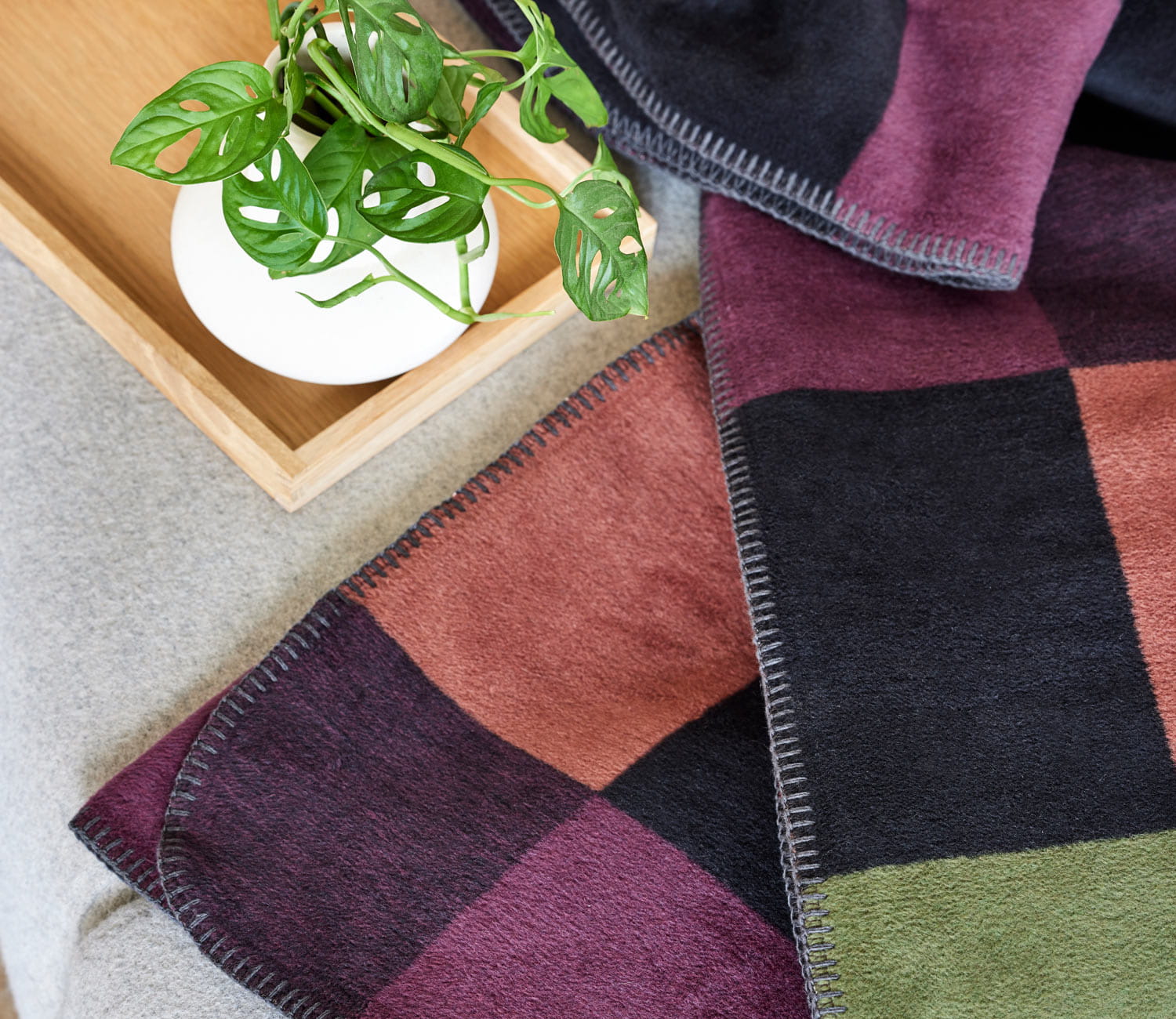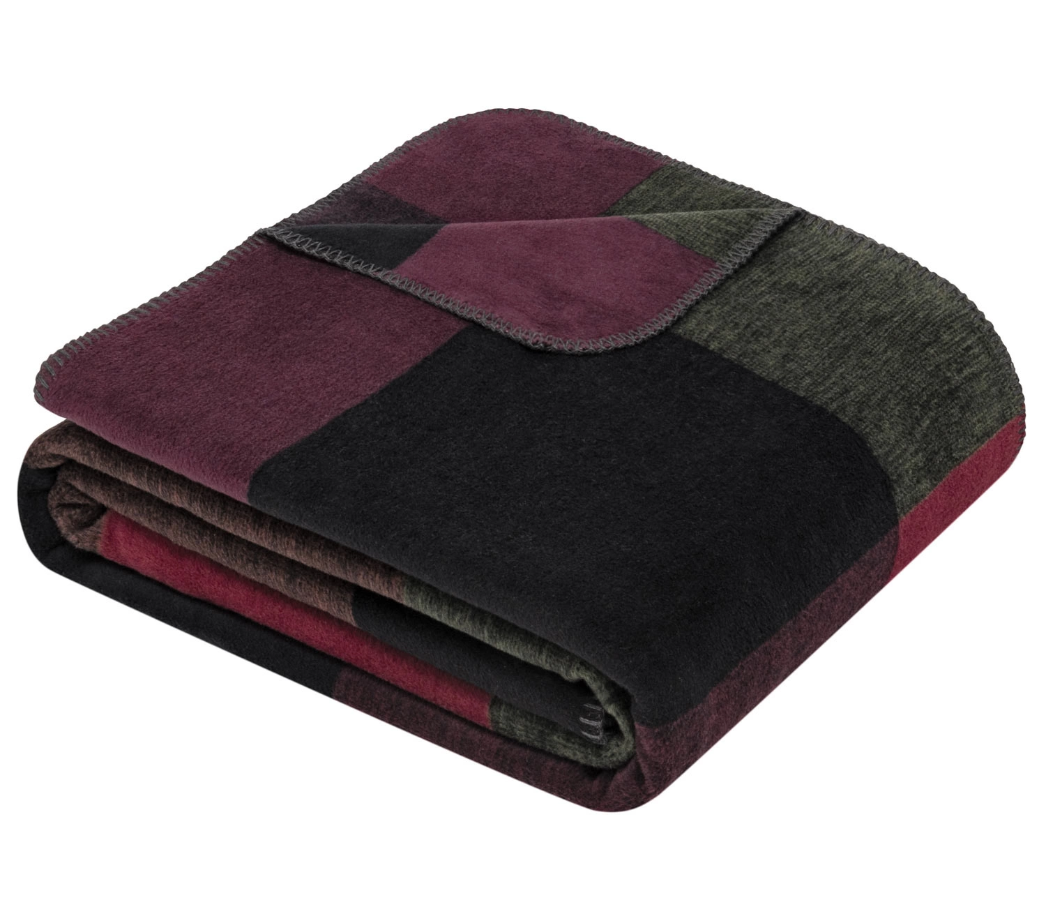 Miły w dotyku koc Bolton marki Ibena w prostą kratę w odcieniach zieleni, pomarańczu i fioletu. Wykonany z mieszanki bawełny z akrylem, wykończony ściegiem dzierganym. Takie połączenie sprawia, że koc jest ciepły, miękki i bardzo trwały.