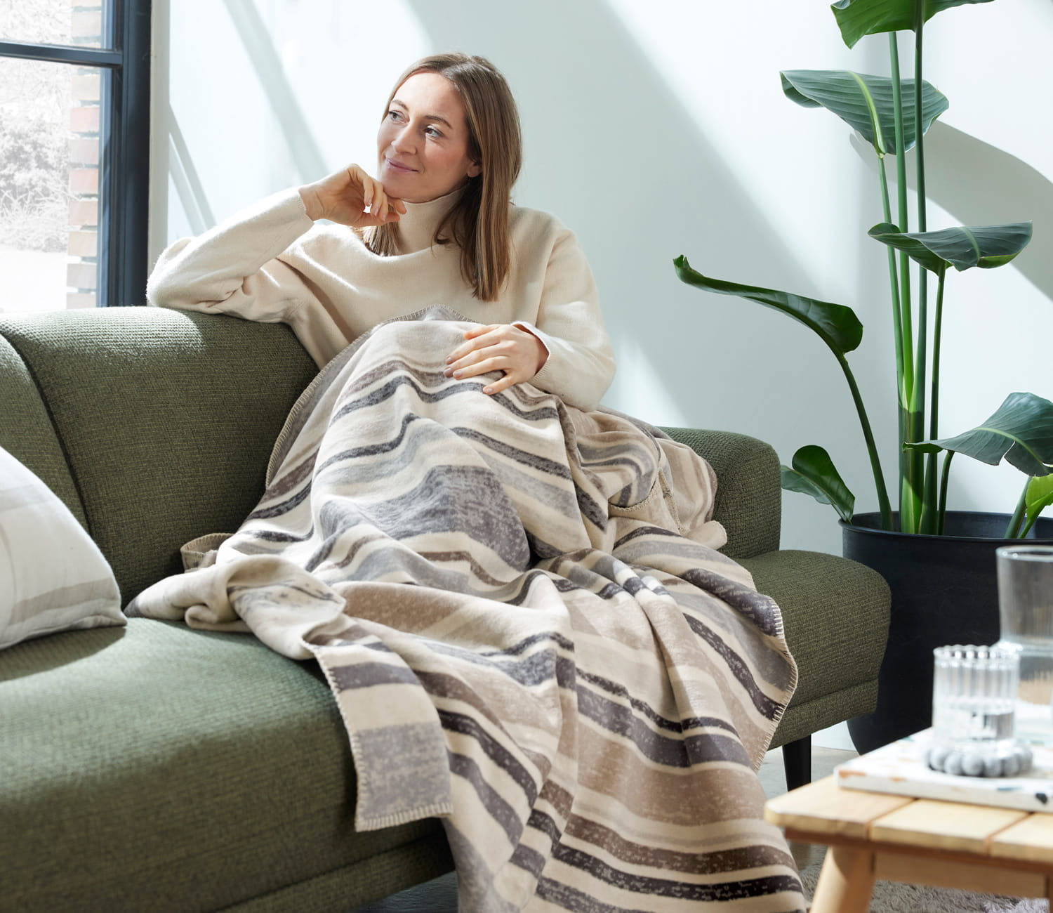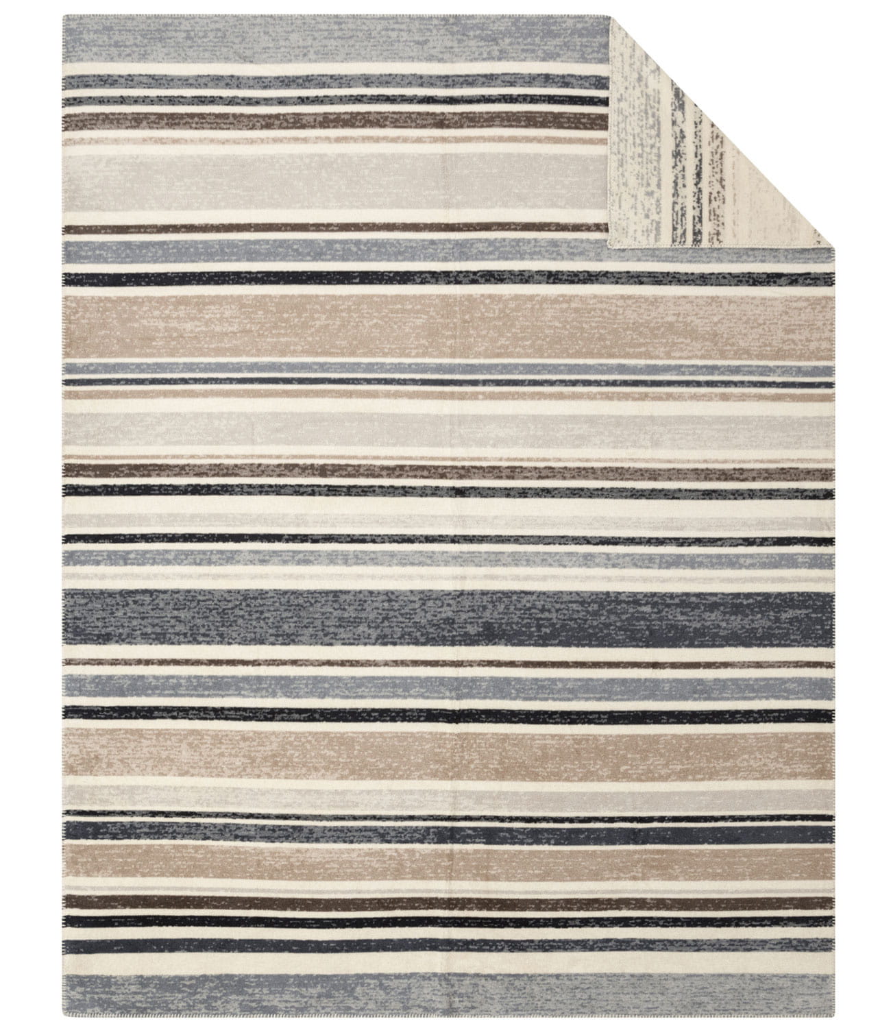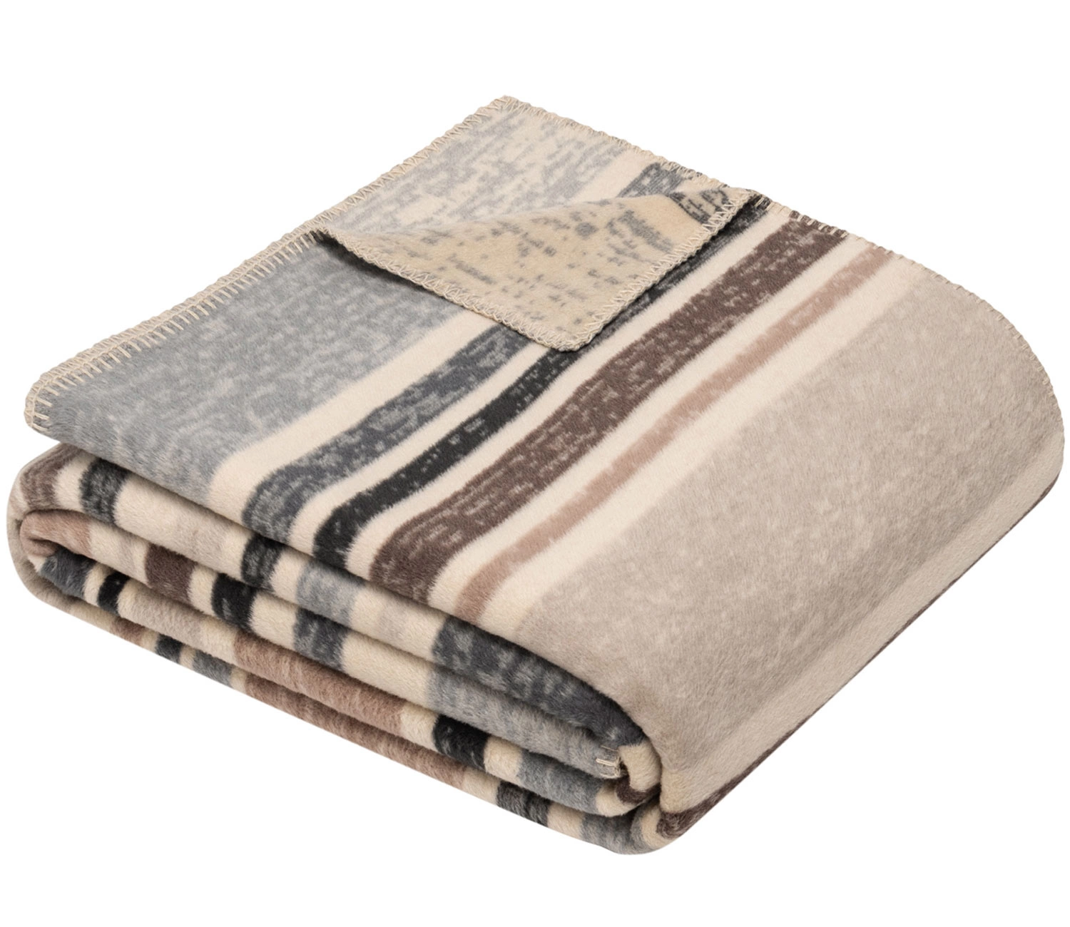 Koc Kumba marki Ibena w różnorodne, poprzecierane pasy w odcieniach beżu i szarości. Wykonany z przyjemnej w dotyku mieszanki bawełny z akrylem. Takie połączenie sprawia, że koc jest ciepły i miękki. Wykończony ściegiem dzierganym.
