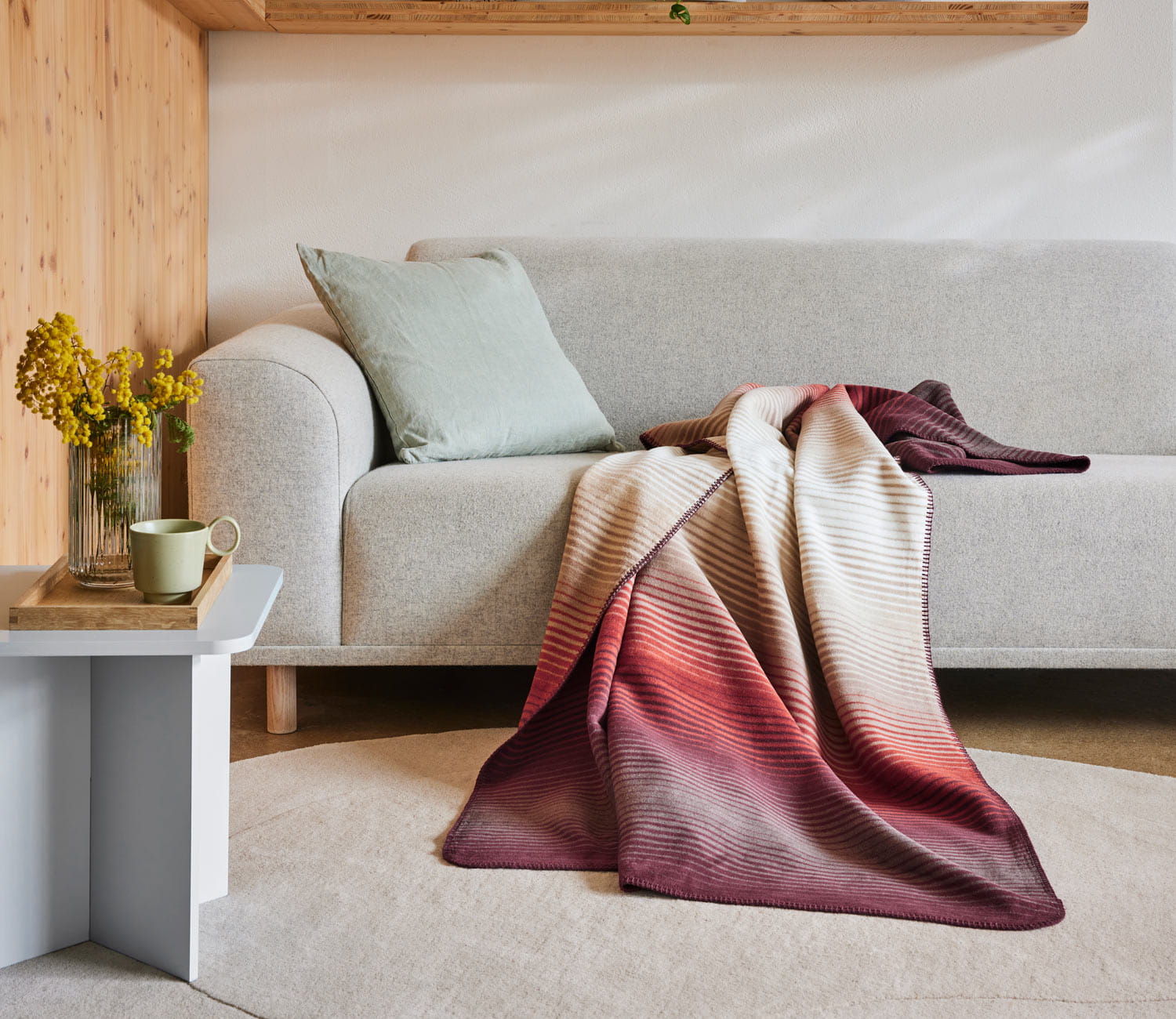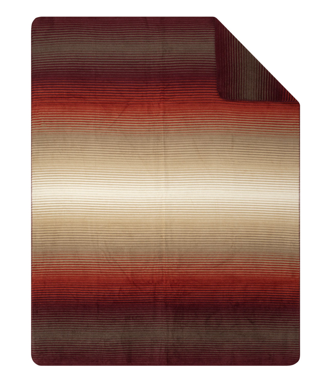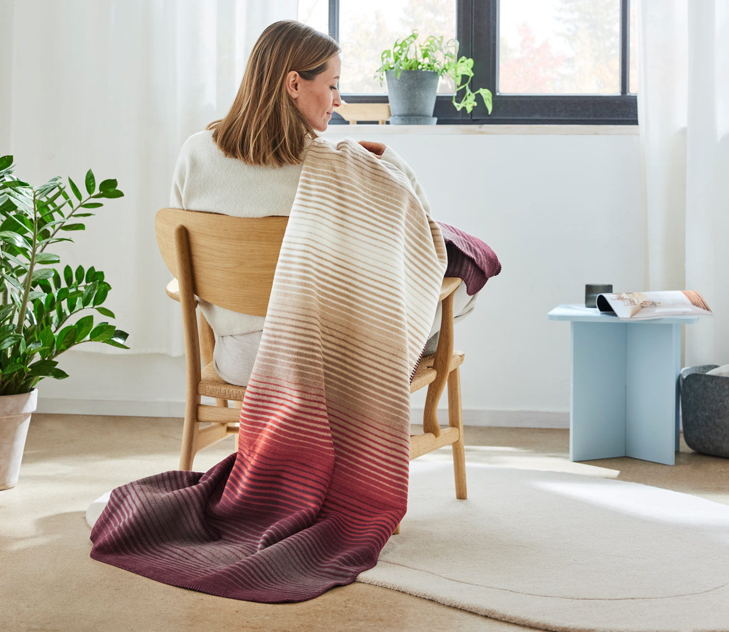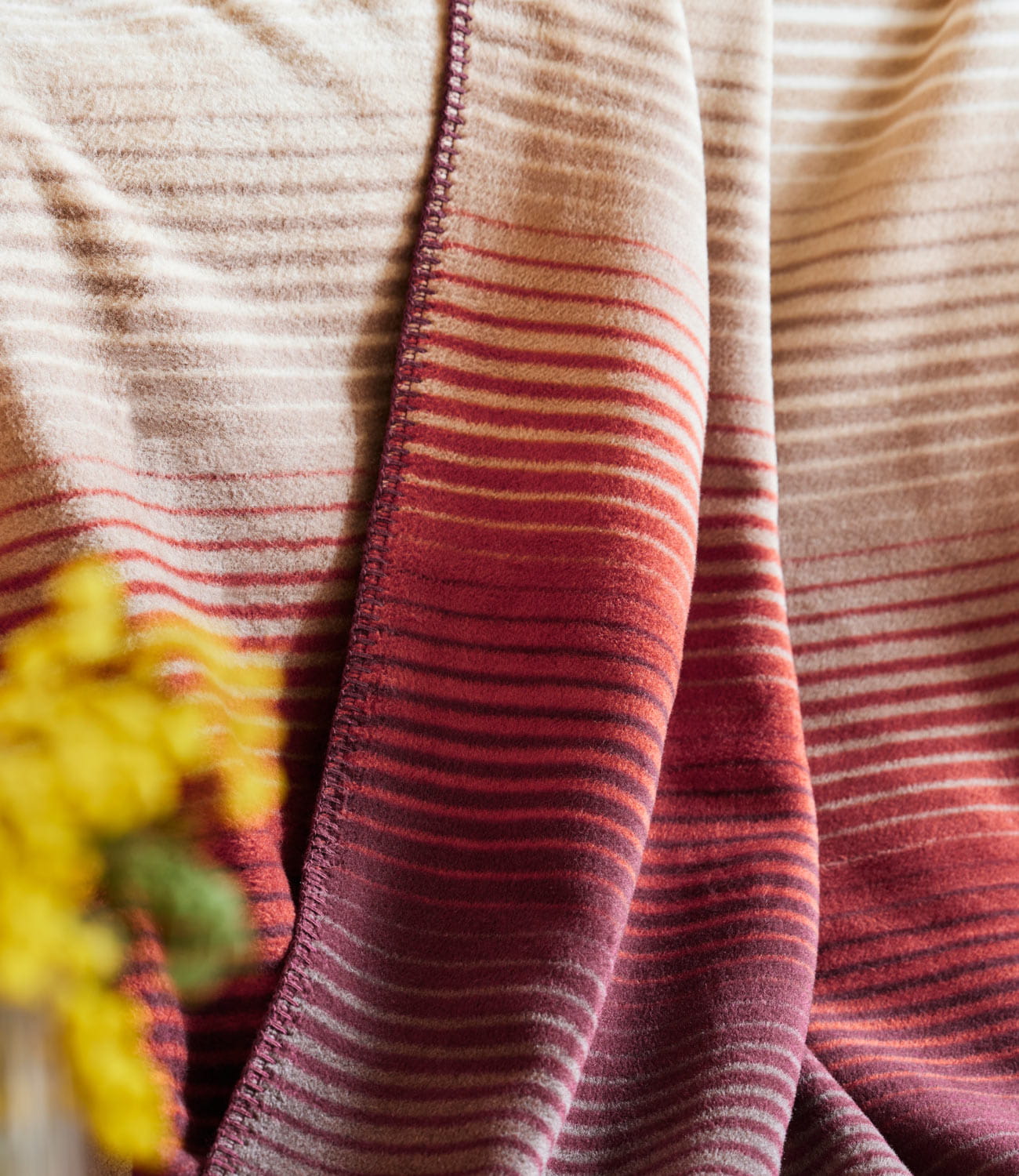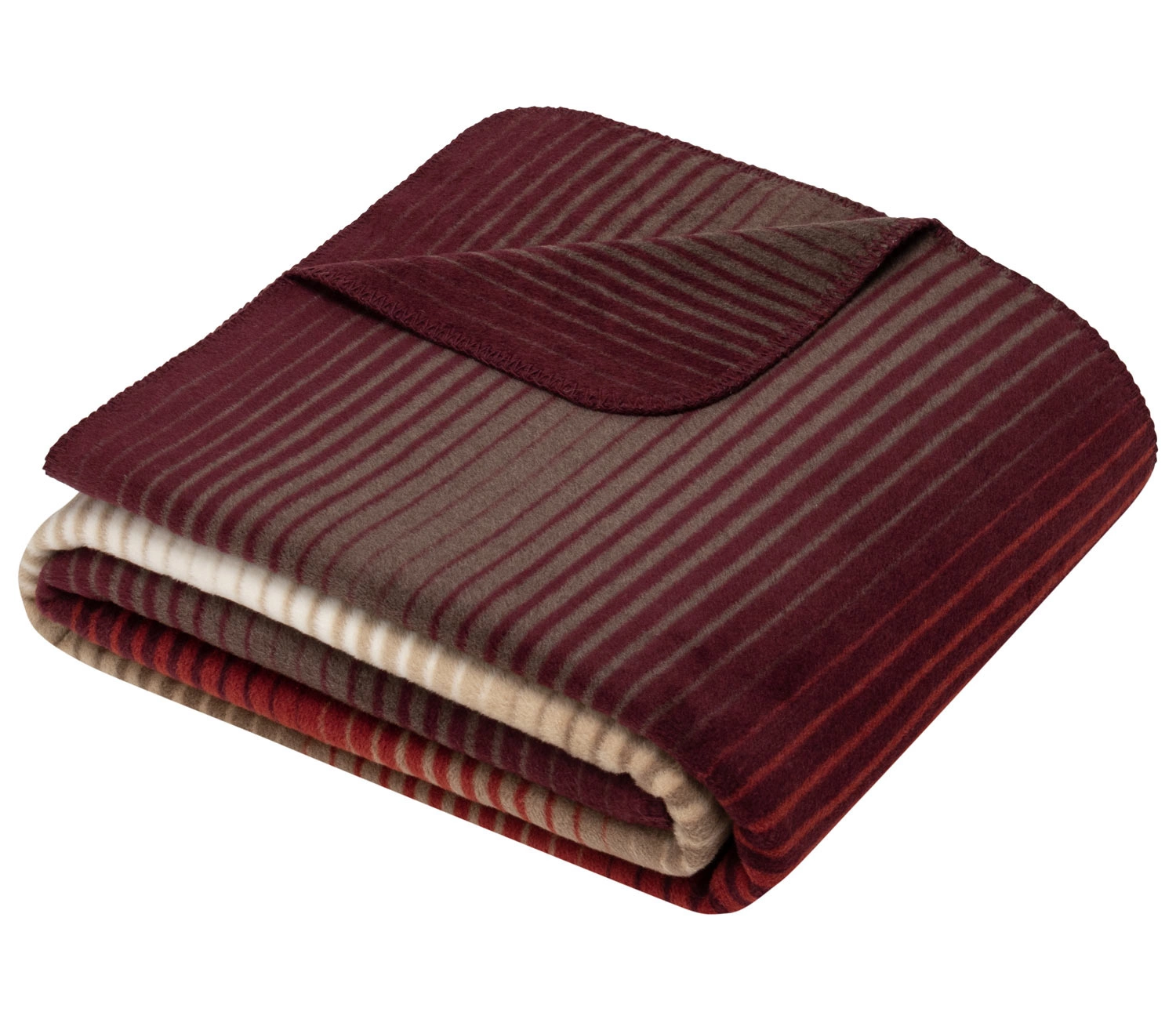 Koc Ranchi marki Ibena w różnorodne pasy w odcieniach beżu, czerwieni i fioletu. Wykonany z przyjemnej w dotyku mieszanki bawełny z akrylem. Takie połączenie sprawia, że koc jest ciepły i miękki. Wykończony ściegiem dzierganym.