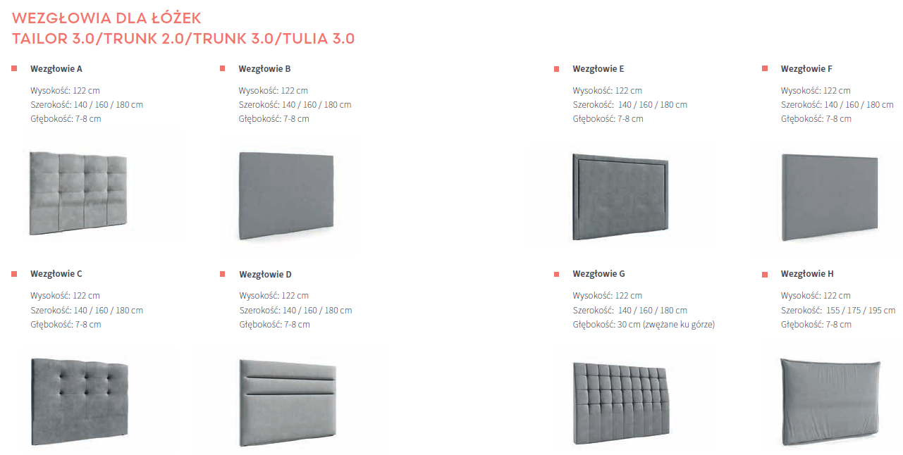 - Wezgłowie w 3 wariantach: Design, Classic i Tulia