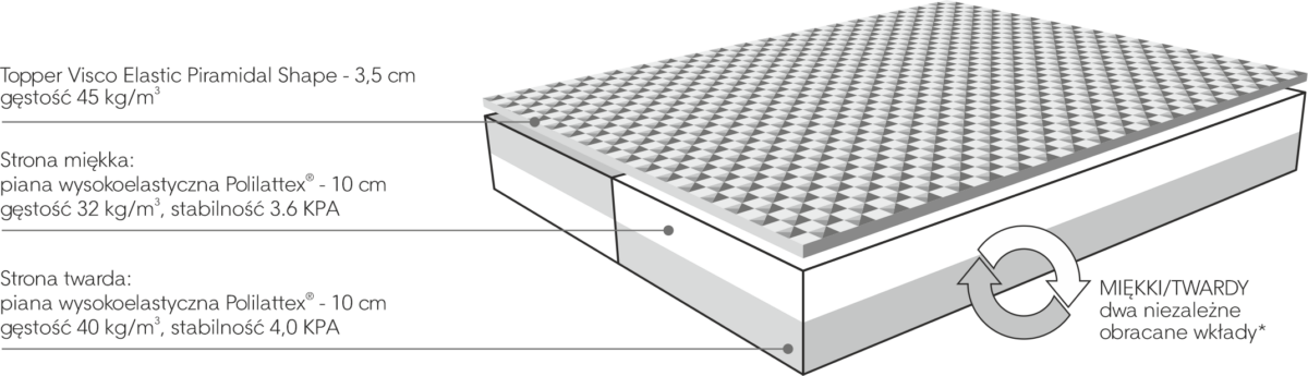 - topper Visco Elastic Piramidal Shape: 3,5 centymetrowa odpowiednio profilowana nakładka z pianki visco o gęstości 45 kg/m3. Poprawia komfort nocnego odpoczynku.