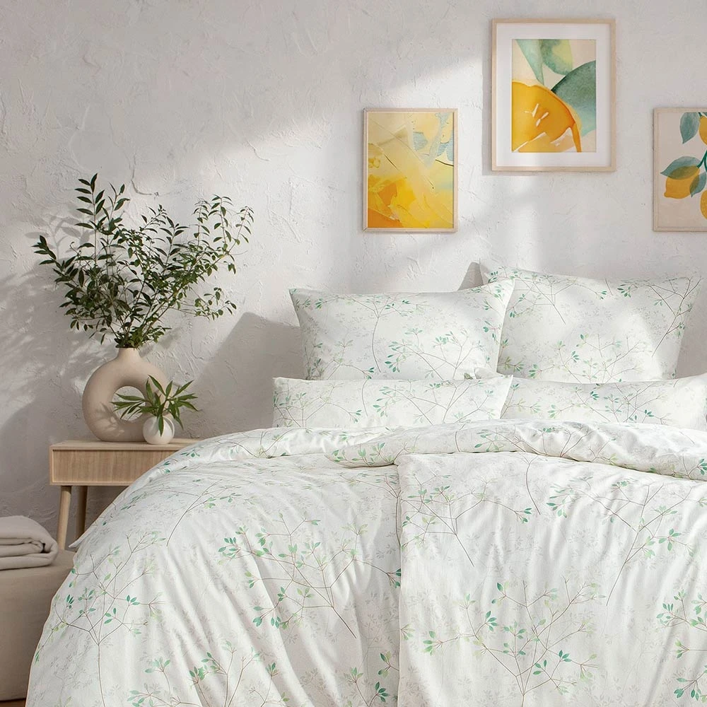 Svenja – delikatna harmonia natury w Twojej sypialni Pościel Svenja to połączenie świeżości natury z subtelną elegancją. Delikatne, zielone gałązki i liście na tle przypominającym akwarelowe malowidło tworzą wyjątkowy efekt wizualny. Z każdym spojrzeniem zestaw zdaje się wprowadzać do przestrzeni coraz więcej harmonii i spokoju, wypełniając ją relaksującą aurą. Idealna do tworzenia spokojnej, naturalnej atmosfery w sypialni.